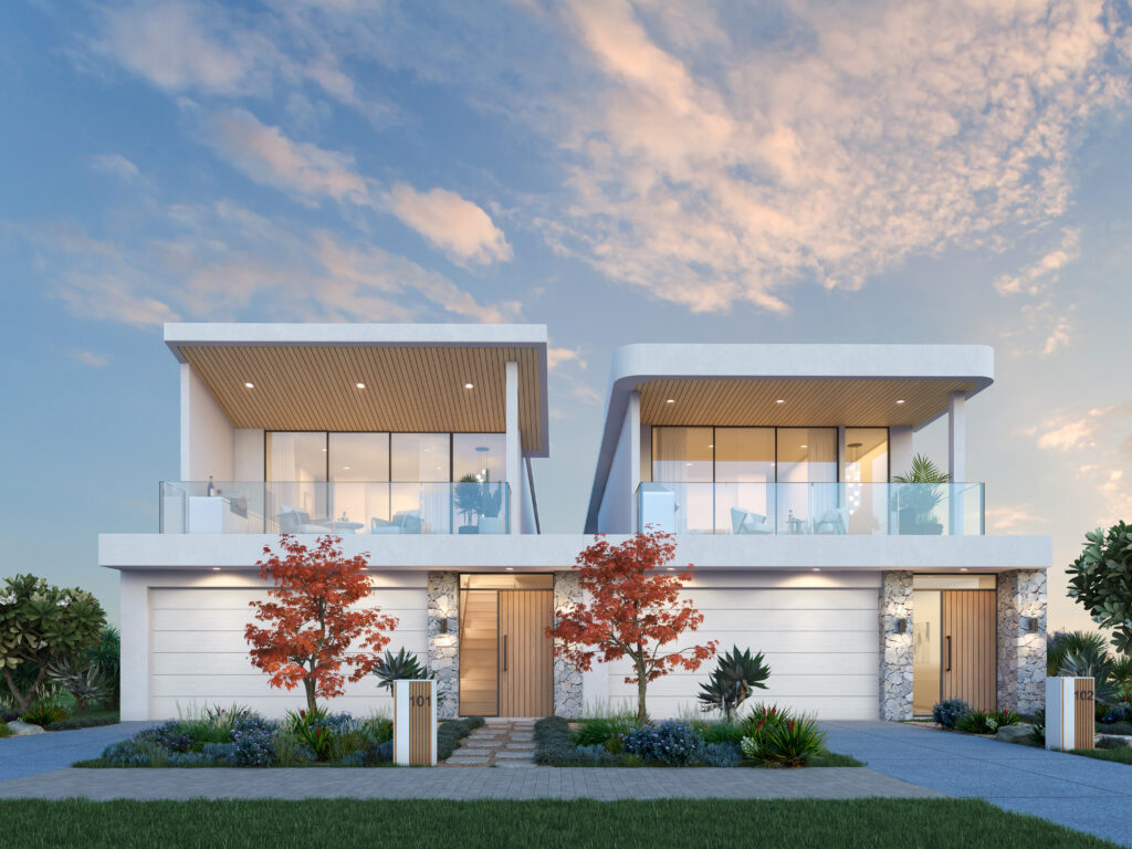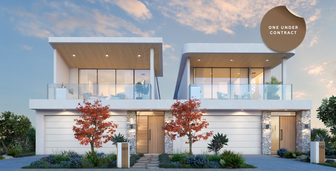 Sculptural façades echo the curve of the coastline — one crisp and contemporary, the other gracefully arched like a breaking wave. Warm timber look soffits, stone feature pillars, expansive glass balustrades and marine-grade Colourbond Ultra roofing create a striking yet understated street presence. Designed to capture cooling sea breezes and frame uninterrupted ocean horizons, these are homes that live and breathe with the rhythm of Aldinga Beach.